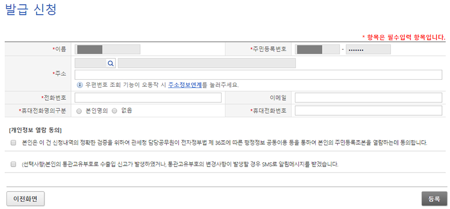 6. 본인인증이 정상처리되면 개인통관고유부호 발급 신청화면이 나오고 본인 인증시 입력한 개인정보 외에 주소, 전화번호, 이메일을 추가 입력하고 등록 버튼 선택
